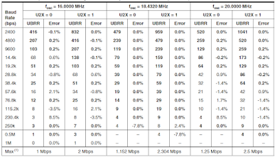 BAUD greitis nustatomas keičiant UBBR registrą, kadangi jis yra 16bitų, tai nustatoma žemesnioji L ir aukštesnioji H dalis atskirai. UBBR reikšmę galima paskaičiuoti pagal formulę duotą oficialiame Atmega datasheet.